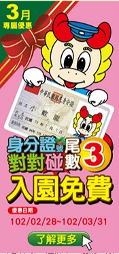 3月份只要您的身分證字號尾數是3,就有32天免費暢遊小人國的機會唷!