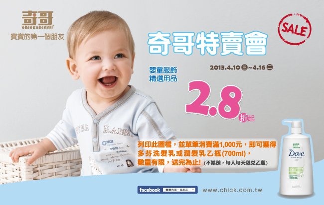 奇哥特賣會來囉!爸爸媽媽快來搶便宜!特賣會期間憑以上圖檔(須列印出紙本,使用完畢後由銷售人員回收處理),並單筆消費滿1,000元以上,即贈”多芬洗髮乳或潤髮乳700ml”乙瓶!每人每天限兌換乙瓶。