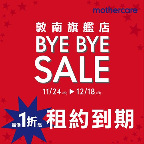 Mothercare敦南旗艦店因店面租約到期,房東將收回店面不再續租,預計營業至2016/12/18!敦南旗艦店將推出最終回饋,特賣日期2016/11/24(四)~12/18(日)。