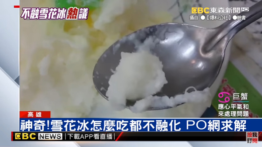 民眾到豐原吃雪花冰,吃到快要離開店裡了,發現怎麼冰都沒融,po網問這個冰有什麼問題,我們問了賣一般傳統雪花冰的業者,他們說,如果加了乳化劑會讓雪花冰不會快速融化,如果是純天然製成,幾乎2分鐘後就會開始出水,不過也有店家標榜他們的冰真的比一般雪花冰要融化的慢,店家引進特殊韓國製冰機,因為製冰過程是在超低溫下冷卻,沒有經過熱氣,比一般雪花冰融化速度慢一倍。